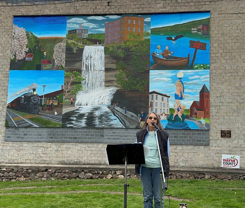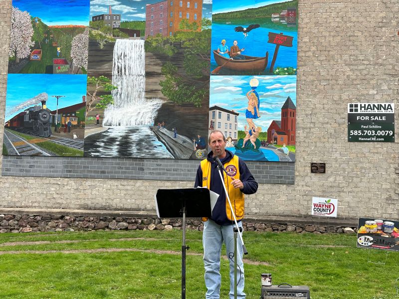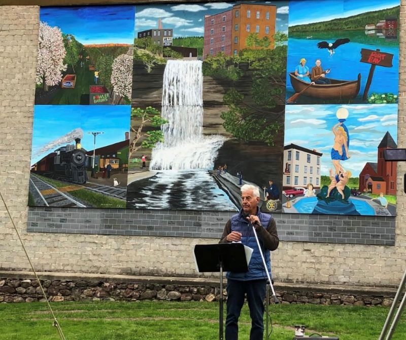 Lions Club member, Joe Gregg spoke of community, business, and service organization efforts to bring this mural back to health. The mural artists, Mark Williams, Breanne Dohn, and Bev Owen each shared their experiences and connections to working on this mural. Wolcott Historian Kara Chapin talked about the history of each of the mural’s panels. Mark took time to explain the stories behind many of the people and animals who appear in the mural, each of who have a significant connection to Wolcott or Mural Mania.