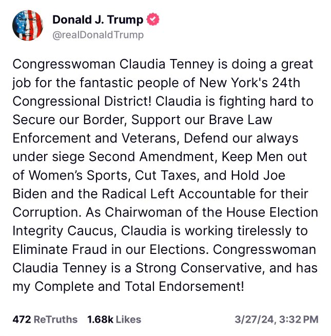 Former President Donald Trump has endorsed Congresswoman Claudia Tenney in her re-election bid for the 24th Congressional District. Mr. Trump made the announcement on his Truth Social account.