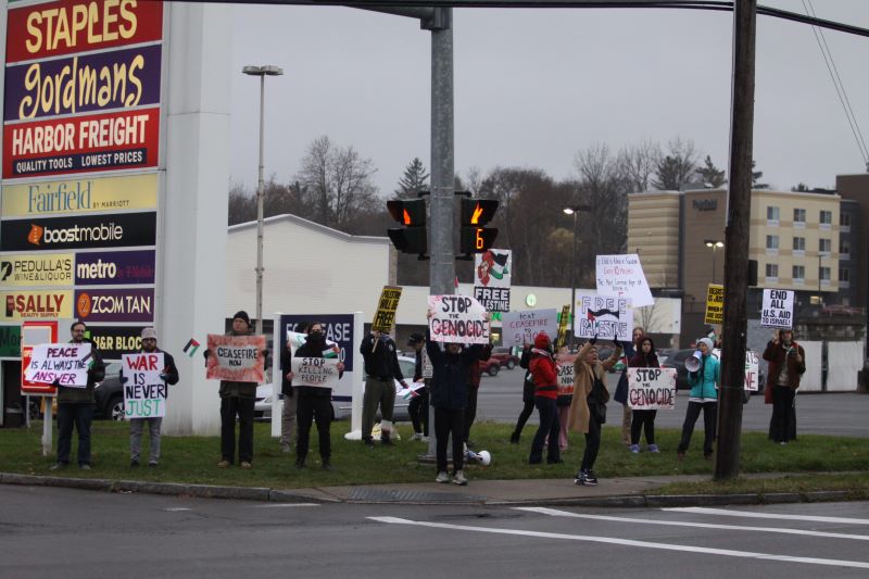 A small group of demonstrators gathered along Hamilton Street in Geneva Wednesday evening protesting the United States support of Israel’s war with Palestine.