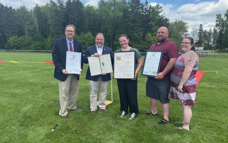 Palmesano and Rogers visited the Dundee Junior-Senior High School earlier today to join Mullin and her family, school administrators and staff, coaches, and teammates to present an official Legislative Resolution (J1068/K594) sponsored jointly by Palmesano and O’Mara honoring Mullin’s championship.