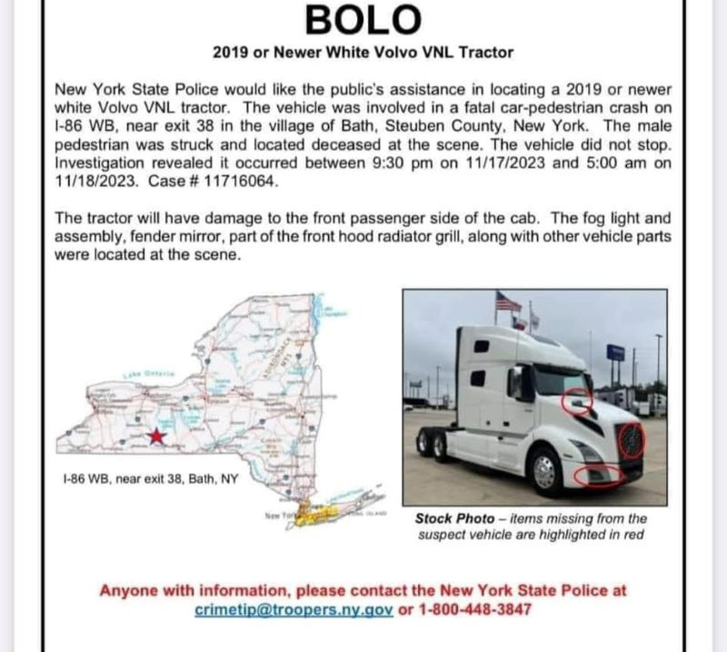 The Volvo VNL tractor was headed west on I-86 in the village of Bath when it fatally struck 40-year-old John Viviano, of Sidney, NY, and continued on without stopping. Viviano was pronounced dead at the scene. The accident occurred between 9:30 last Friday night and 5 o’clock Saturday morning. Investigators say they are looking for a 2019 or newer white Volvo that would have damage to the front passenger side of the cab. The fog light and assembly, fender mirror, part of the front hood radiator grill, along with other parts belonging to the vehicle were located at the scene.