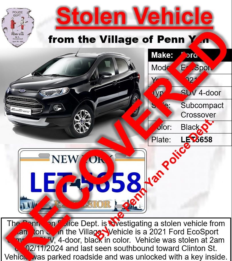 A vehicle that was stolen in the village of Penn Yan over the weekend has been recovered.