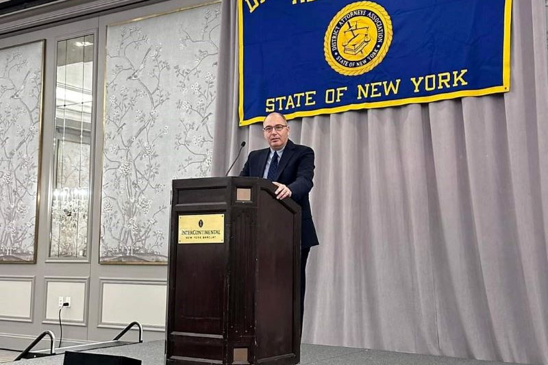 In accepting the award, DA Fazzary told the crowd, which included district attorneys and assistant district attorneys from across the state, NYS Chief Administrative Judge Joseph Zayas, and NYS Governor Kathy Hochul, that when he started, he was only part-time, had one part-time assistant district attorney, and his county didn’t provide the District Attorney with an office. He stated that he initially procured grant funding from New York State and with that money he built up the DA’s Office. He said this allowed him to not only try cases, but also to act as a special prosecutor for many surrounding counties, to teach prosecutors from all over the state at the New York Prosecutor’s Training Institute, to speak to victim advocate groups across the state, and to create a regional justice center for victims in Montour Falls. Fazzary said this award was an honor of a lifetime.