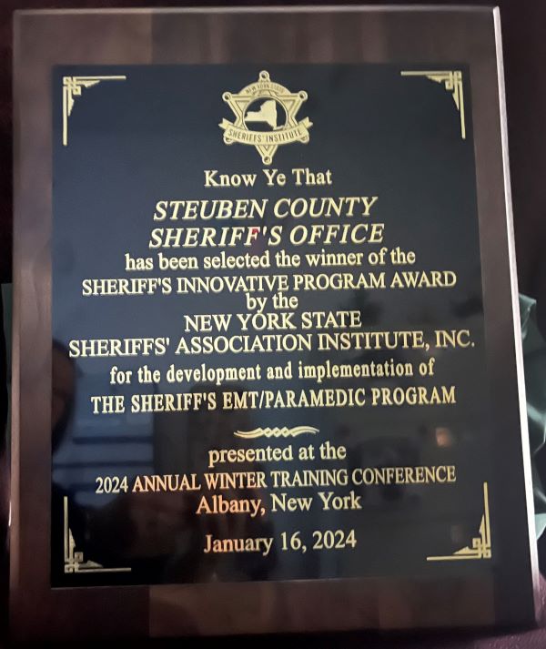 The Sheriff’s Association Institute presented Steuben County Sheriff Jim Allard with the award in recognition of the department’s recent development and implementation of the Sheriff’s EMT and Paramedic program, which was a direct result of the county’s lack of paramedics and EMTs.