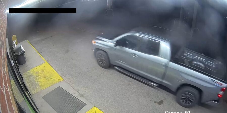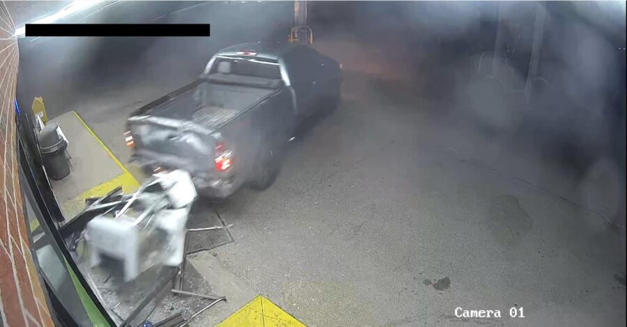 The gray pickup truck crashed through the front entrance of the store between 3:30 and 4 a.m. It was reported stolen from the nearby town of Wheeler and has significant damage to its rear end. One suspect was wearing work boots and the other white sneakers. Both were wearing dark-colored clothing.