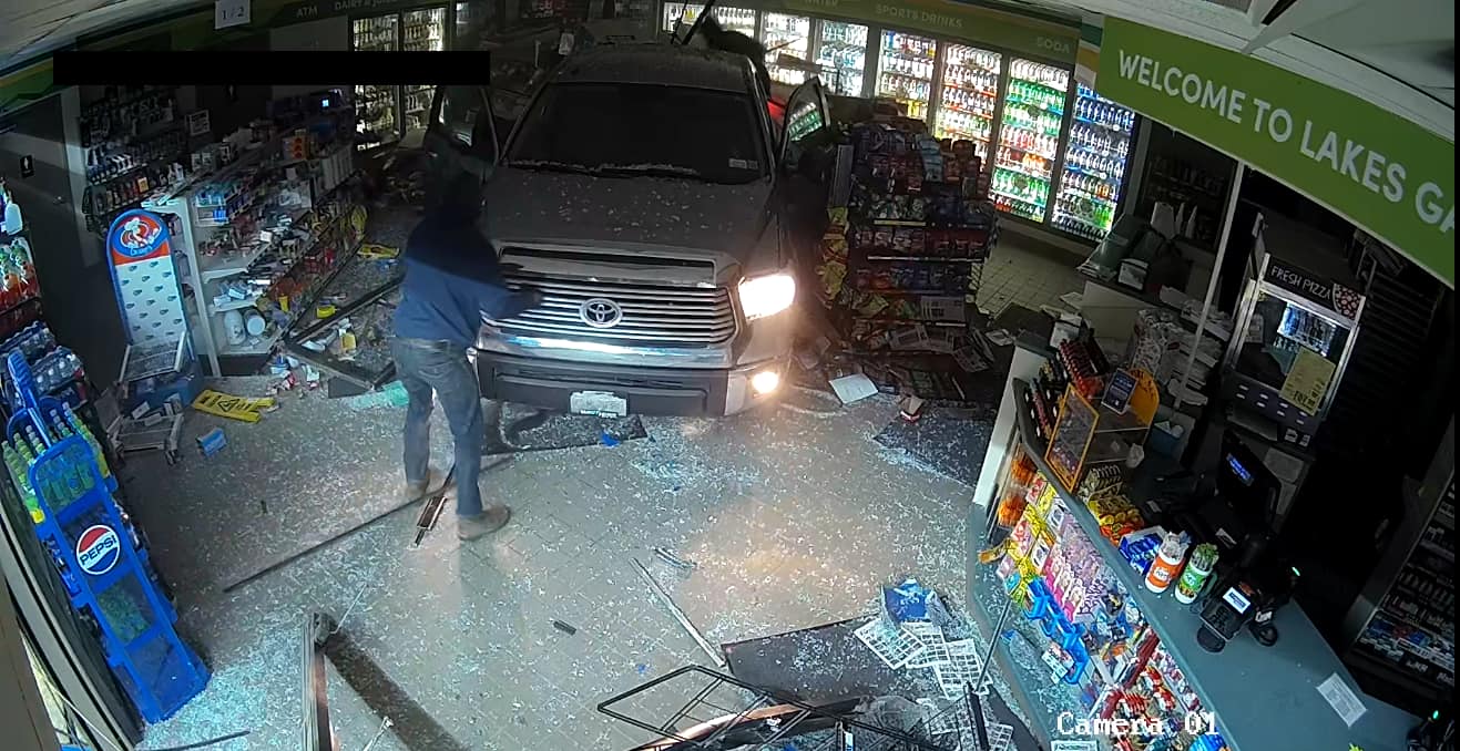 The gray pickup truck crashed through the front entrance of the store between 3:30 and 4 a.m. It was reported stolen from the nearby town of Wheeler and has significant damage to its rear end. One suspect was wearing work boots and the other white sneakers. Both were wearing dark-colored clothing.