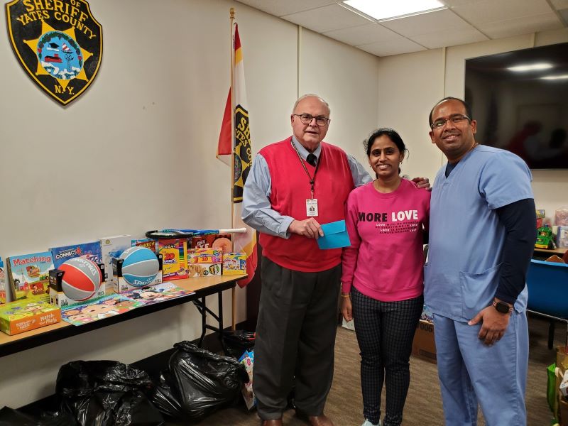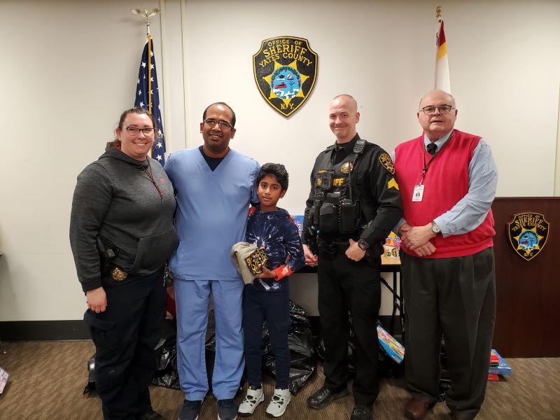 “The members of the Yates County Law Enforcement Officers Union council 82, local 1869 would like to again express our heartfelt thank you to a very special young man and his family. Ram is pictured with his parents, mother Phani, and father Dr. Sai Guduru. We thank you and your extended family at Eaves Family Dental for taking part in this program each year to help our staff make for a special holiday season.”