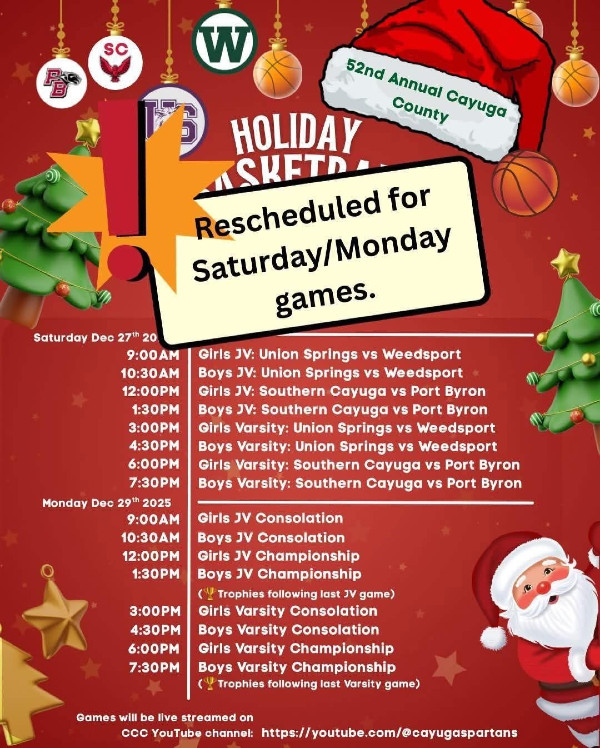 The 52nd Cayuga County Holiday Basketball Tournament has been rescheduled due to forecasted inclement weather.