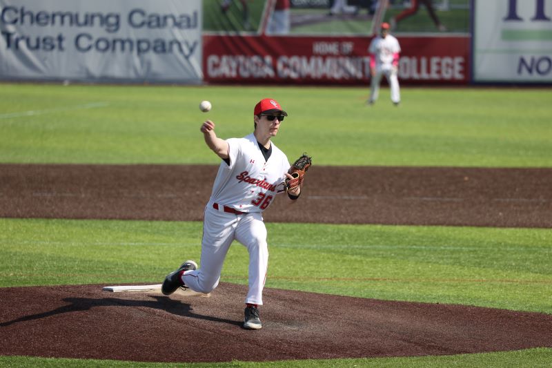 Knoll controlled the opener from the first inning, allowing only one hit and striking out four while throwing a complete game. At the plate, Cayuga scored a run in the second on a sacrifice fly from Isaac Allison, then in the third inning a three-run homer by Jeremy Recio and a two-run homer from Alejandro Diaz made it 6-0. Recio powered Cayuga’s offense later in the game, driving-in two in the fourth inning with a single and another run in the sixth with a triple.