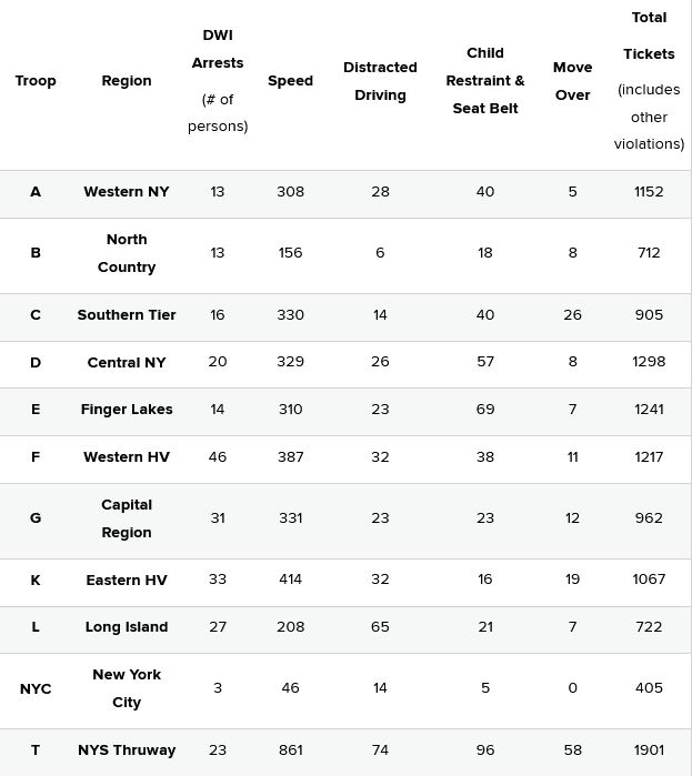 During the campaign, which was funded by the Governor’s Traffic Safety Committee, the New York State Police utilized sobriety checkpoints, additional DWI patrols, and underage drinking and sales to minors detail. State Police also ticketed distracted drivers who use handheld electronic devices.
