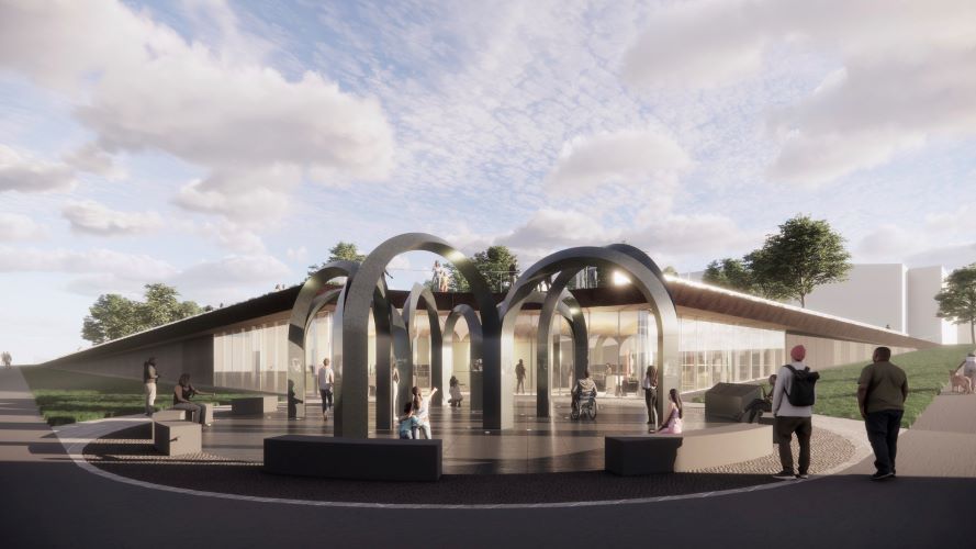 The final design proposes ten interconnected pillars, inscribed with the names of victims and survivors, each with a unique arc and height, faced with stone. It also features a sweeping support building that operates as a central hub for education, exhibitions, community activities, gatherings, and events. Visitors will also find an elevated Memorial Walk on the roof of the support building.
