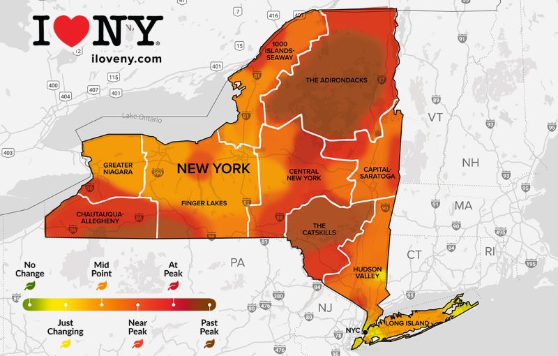 Beautiful peak foliage will be found in parts of all nine Upstate New York regions this weekend, as it makes its way out of the upper elevations of the Adirondacks and Catskills. Most upstate foliage will range from midpoint to near-peak, while leaves on Long Island will mostly be at midpoint of change and most of New York City will still be in the early stages of transition. This is according to the field reports from more than 85 volunteer observers for the Empire State Development Division of Tourism’s I LOVE NY program.