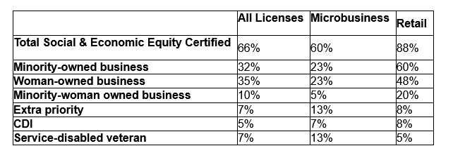 After the Office recommended to the Board the 109 adult-use licenses to be awarded at today’s Board Meeting, it analyzed the composition of such licensees. The Office is pleased to report a significant milestone: two-thirds (66 percent) of all such licensees are social and economic equity (SEE) owned businesses. One-third (35 percent) are women-owned businesses and another third (32 percent) are minority-owned businesses. 10 percent are minority-women-owned businesses. The full breakdown is listed below.