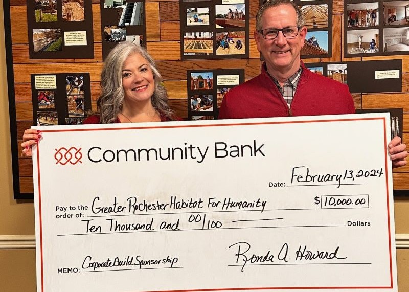 Community Bank recently presented $10,000 to the Greater Rochester Habitat for Humanity to sponsor several team-building days for a Habitat for Humanity home in Rochester this year.