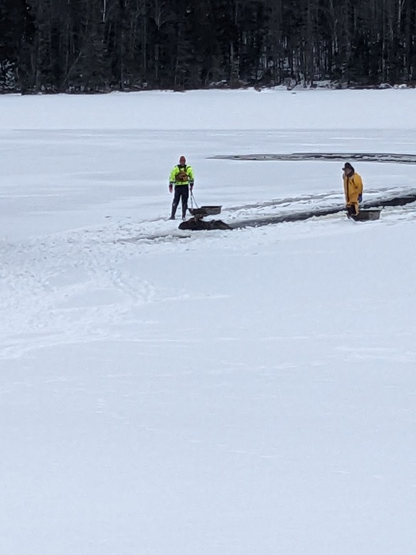 Forest Rangers Nahor, Savarie, and Baldwin arrived a short time later to assist with rescuing the moose. Dressed in cold-water rescue gear, the Officers ventured out onto the ice. Ranger Nahor began cutting a channel with his chainsaw while Lieutenant Higgins cleared the ice blocks, creating a pathway for the moose to free itself. Rangers Savarie and Nahor then guided the moose to shallow water near the shore. Once free from the water, the moose made several attempts to get up before regaining its strength, standing up on the stable ice, and walking off into the woods.