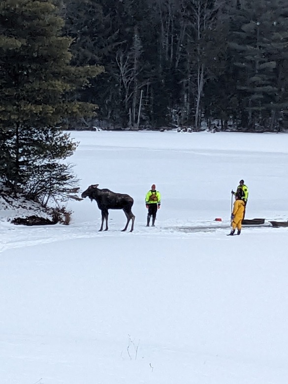 State Department of Environmental Conservation Forest Rangers and Environmental Conservation Police Officers this week rescued a moose that had broken through the ice and into the icy waters of Lake Abanakee in frigid waters in Hamilton County.