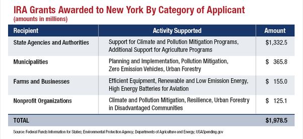 Energy, clean air, and conservation programs funded through the IRA provide over $142 billion through federal programs managed by several U.S. agencies. New York state agencies and authorities, municipalities, businesses, and nonprofit organizations have been awarded nearly $2 billion in grants to date.