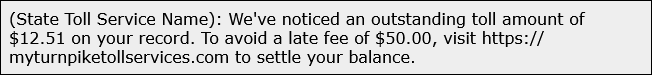 The texts claim the recipient owes money for unpaid tolls and contain almost identical language. The “outstanding toll amount” is similar to the complaints reported to the IC3. However, the link provided within the text is created to impersonate the state’s toll service name, and phone numbers appear to change between states.