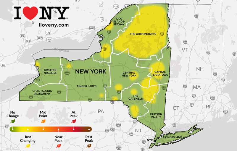 New York State’s 2024 fall foliage season is underway, with the first signs of the spectacular seasonal colors to come appearing in several Upstate New York regions. The Adirondacks, Catskills, Thousand Island-Seaway, Capital-Saratoga, Central New York, Finger Lakes, and Greater Niagara regions are all beginning to show indications of autumn’s brilliant palette, according to the field reports from volunteer observers for the Empire State Development Division of Tourism’s I LOVE NY program. Foliage change in other areas of the state will be 5% or less.