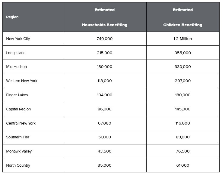 This proposed expansion will put money back in the pockets of around 1.6 million families overall statewide and lift up the financial fortunes of over 2.75 million children. A regional breakdown provided by the Governor’s Office can be seen below: