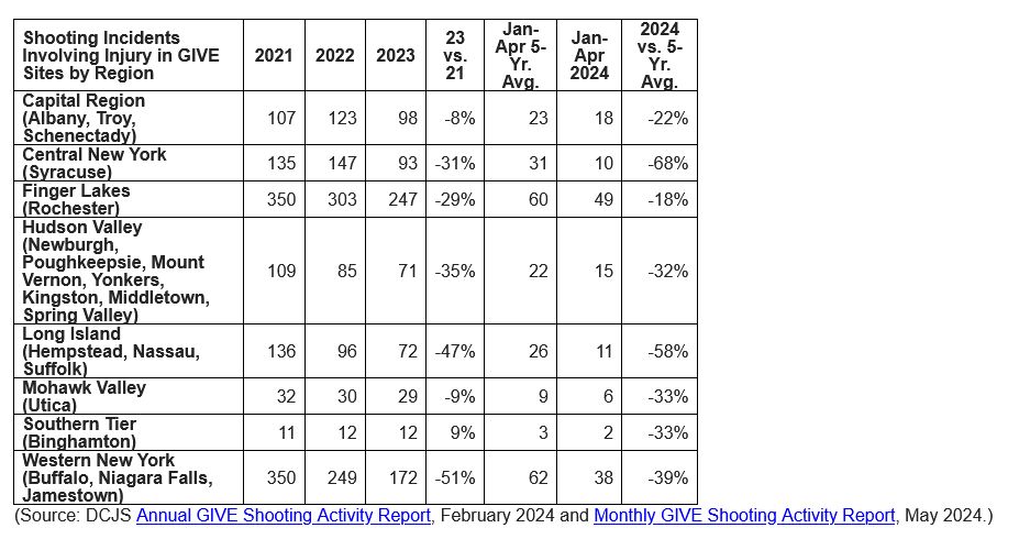 According to figures released by the Governor’s office, shooting incidents with injury and the number of shooting victims each decreased by more than 35 percent through April, compared to the January to April average over the last five years, in the major metropolitan areas outside of New York City. This reduction reflects 84 fewer shootings (143 vs. 227), 94 fewer victims (170 vs. 264), and 13 fewer lives lost to gun violence (29 vs. 42) as reported by law enforcement agencies participating in state’s Gun Involved Violence Elimination (GIVE) initiative. These positive trends show New York State’s return to historic lows in gun violence and follow two years of progress, including a 35 percent reduction in shootings (816 vs. 1,262), 36 percent reduction in victims (963 vs. 1,508), and a 37 percent reduction in deaths (142 vs. 225) from 2021 to 2023.