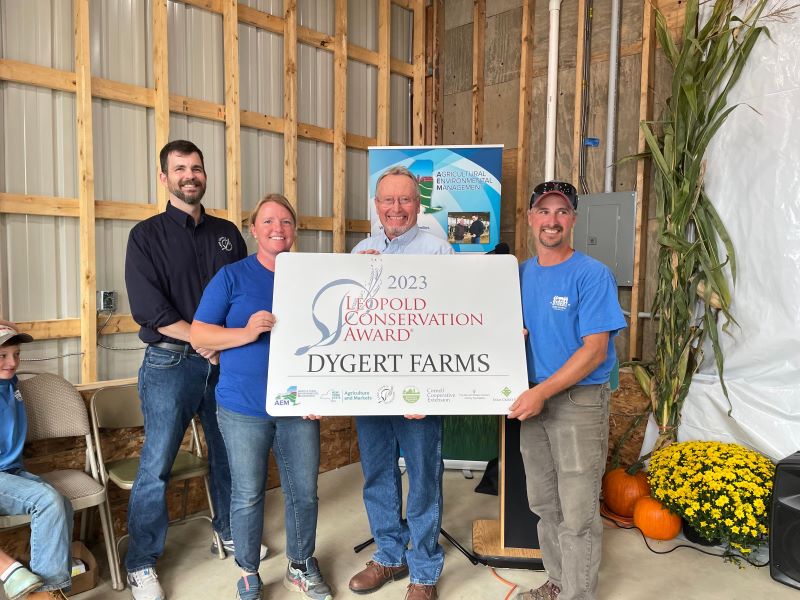 Dygert Farms of Palatine Bridge has been selected for the 2023 New York Agricultural Environmental Management (AEM)-Leopold Conservation Award. The distinguished award honors a farm and its nominating Soil and Water Conservation District for their efforts to protect the environment through the preservation of soil and water quality. Commissioner Ball and partners from the Sand County Foundation visited Dygert Farms today, ahead of the start of Climate Week 2023, to present the award during the Dygert family’s celebration of the farm’s tricentennial anniversary this year.