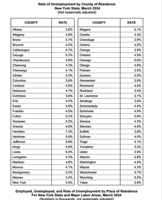 The New York State Department of Labor has released preliminary local area unemployment rates for March 2024. Rates are calculated using methods prescribed by the U.S. Bureau of Labor Statistics. New York State’s seasonally adjusted unemployment rate decreased from 4.4% in February to 4.3% in March 2024.
