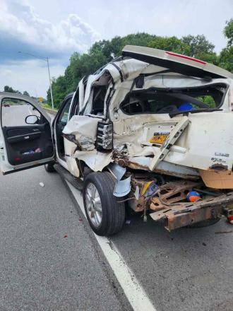 After Trooper Ashley Augustynek pulled over a 2009 Chevy Tahoe, a 2020 Dodge Ram sideswiped her car and struck the Tahoe, causing it to overturn onto the driver’s side.