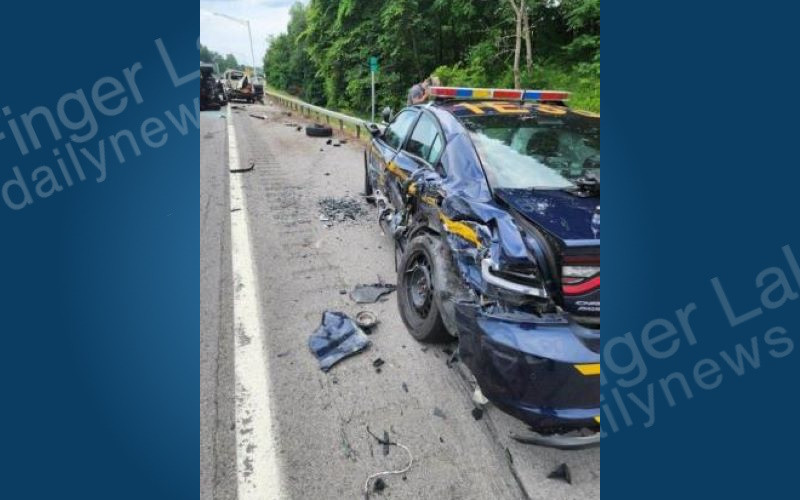 A State Trooper suffered minor injuries after her patrol car was sideswiped as she was conducting a traffic stop on Interstate 590 in the town of Irondequoit.