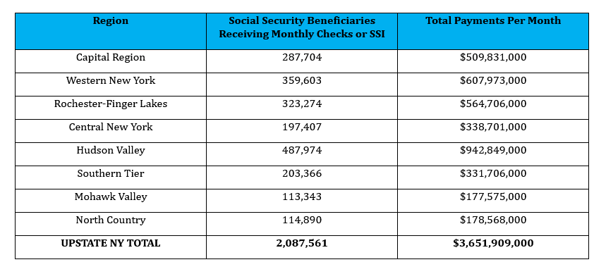 A county-by-county breakdown of Social Security beneficiaries across New York can be found here for SSI and Old Age, Survivors, and Disability benefits.