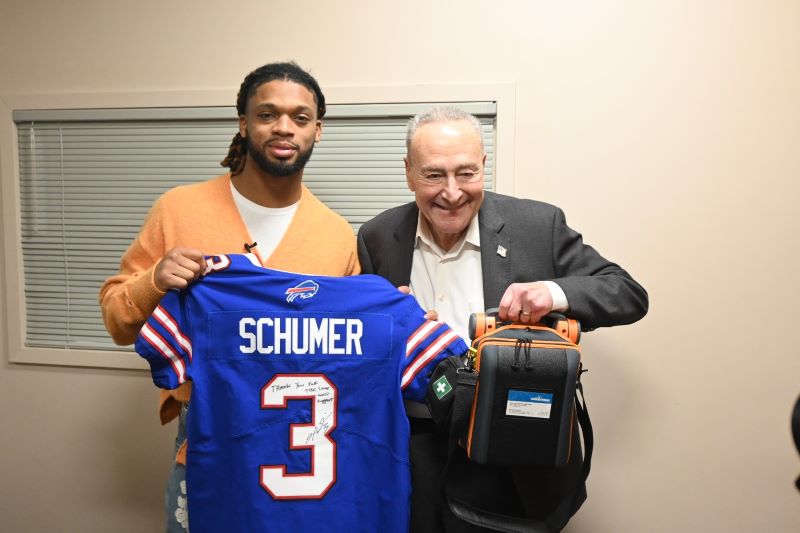 Schumer and Buffalo Bills safety Damar Hamlin worked together on the bill. When Hamlin went into cardiac arrest during an NFL game in January 2023, the Bills medical team used an AED and performed CPR, saving Hamlin’s life. Since then Hamlin has used his recovery story to help kids across the country, working with Schumer to create the new federal program that will help put more AEDs in schools.