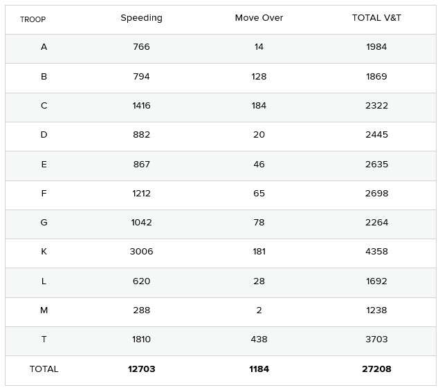 Troopers issued 12,703 tickets for speeding and 1,184 total tickets for Move Over Law violations.