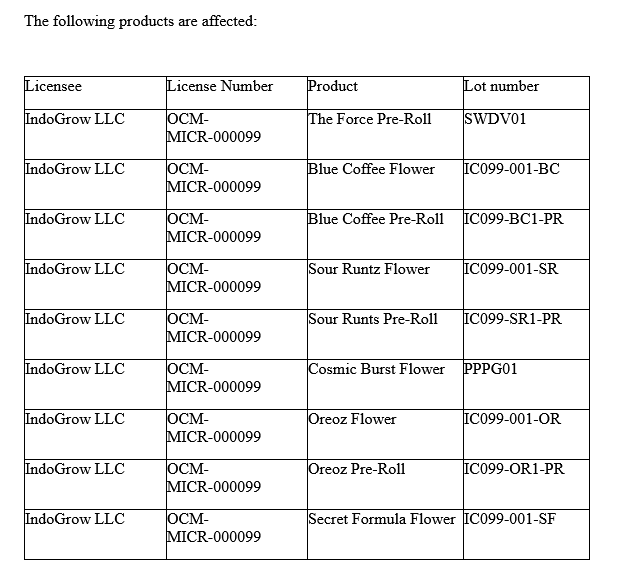Dispensaries and distributors must cease distribution and sales of the affected products immediately. The products above may also go by names that may include Indi, Grow by Indi, Our Creation, and Grow with Us.