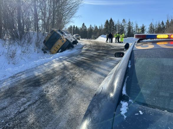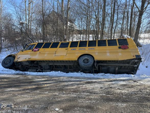 New York State Police say the crash happened around 8:35 a.m. at the intersection of South Hill Road and Singleton Road. Troopers from the Homer barracks responded to find the bus on its side.