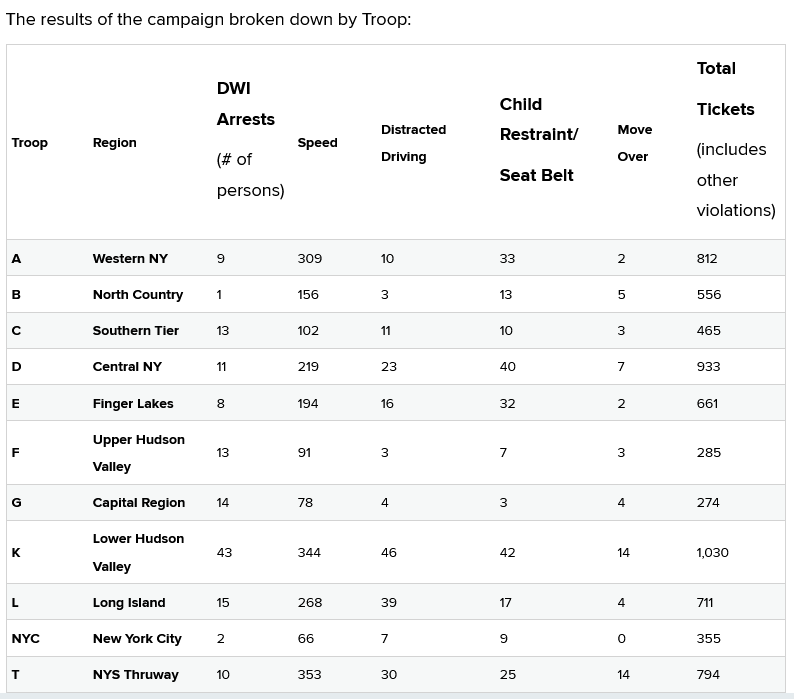 During this enforcement period, State Troopers arrested 139 people for DWI and investigated 245 crashes, which injured 37 people. State Police did not respond to any fatal crashes during the weekend.