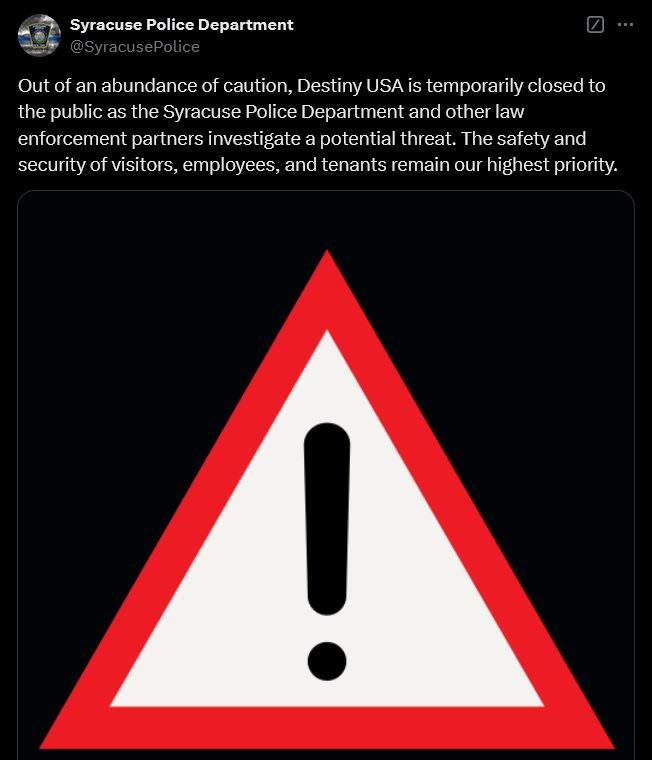 In the morning hours of Friday, December 27th, the Syracuse Police Department was made aware of a specific threat to Destiny USA. Working closely with our local, state, and federal partners, as well as management at Destiny USA, it was quickly determined that this information was both specific and actionable. Therefore, with the public’s safety in mind, a decision was made, in conjunction with Destiny USA ownership, to suspend operations at Destiny USA based on the information received.