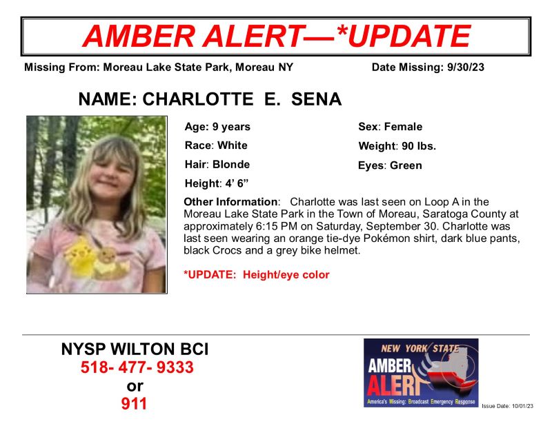On October 2, 2023, through the course of the investigation, State Police identified an individual as being in the area of the Moreau Lake State Park around the time Charlotte went missing. Further investigation led to the search of multiple residences where the individual is known to reside. Upon the search of those residences, at approximately 6:32 p.m. on October 2, 2023, State Police located Charlotte Sena safe and in good health. The suspect was taken into custody.