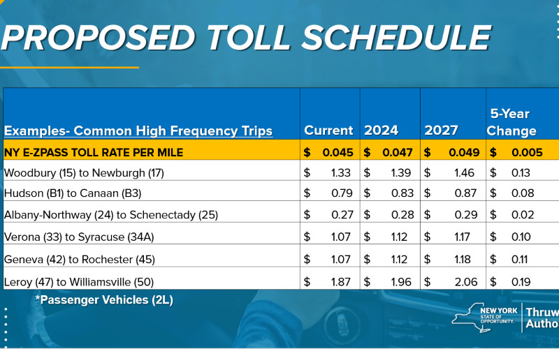 It will cost you a little more to drive along the New York State Thruway starting in 2024. The Thruway Authority’s Board of Directors on Monday approved the first toll hike in 14 years. Beginning in January, E-Z Pass users will see an increase of five percent in their tolls, with a second five percent increase set to go into effect in January of 2027. Non E-Z Pass customers will see their tolls increase to 8.6 cents per mile by 2027. According to the state, the increases are designed to help the Thruway Authority meet its future capital and infrastructure needs.