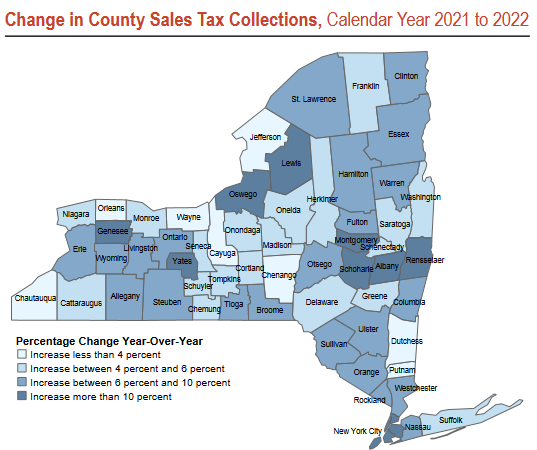 Every county saw some year-over-year growth in sales tax collections in 2022 with 41 out of 57 counties (72%) recording increases ranging from 4% to 10%. Yates County had the strongest growth at 21.1%, followed by the counties of Lewis (14.9%), Montgomery (12.4%) and Schoharie (11.8%). Dutchess County grew the least at 1.6%, followed by the counties of Jefferson, Chenango and Orleans, each at 2.4%.