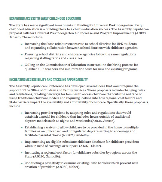 - The Assembly GOP conference has released a comprehensive plan to help parents obtain affordable child care.