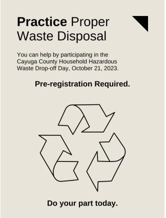 - The Cayuga County hazardous waste drop off day October 21.