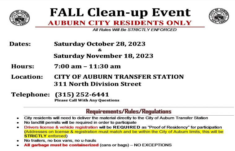 - Fall cleanup days for city residents October 28 and November 18 at the Transfer Station.