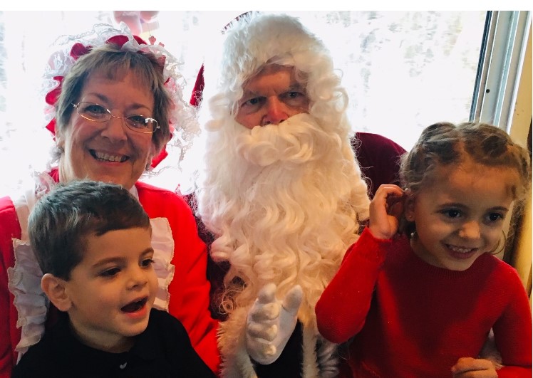 - Kids get to meet Santa and Mrs. Claus, and they receive a coloring book and treats.