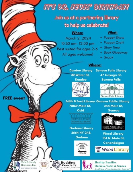 - A Dr. Seuss Birthday celebration in cooperation with the Geneva Public Library, Seneca Falls Public Library, Dundee Public Library, Edith B. Ford Library in Ovid and Wood Library in Canandaigua.