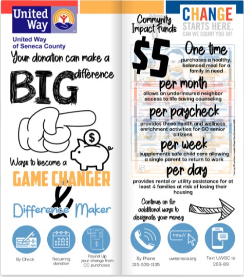 - The new campaign brochure, focusing on the wide ranging impact of United Way on residents’ lives, the partner agencies it funds and the coalitions created to take on the biggest issues in Seneca County.
