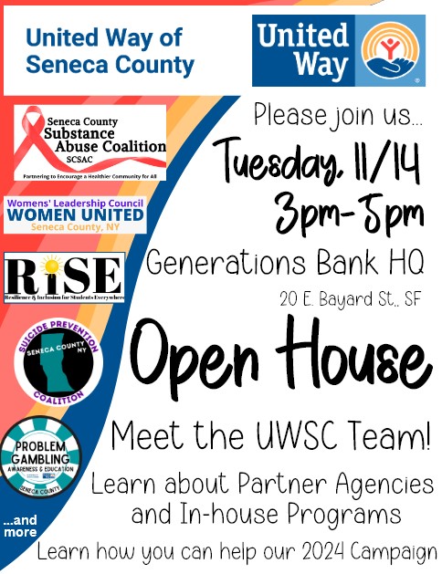 - An open house November 14 from 3-5PM at Generations Bank Headquarters on East Bayard St. in Seneca Falls. Come meet the people from United Way, learn about their partner agencies and direct initiatives and learn how you can help.